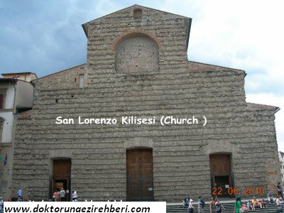 Kilisenin ( Chiesa di San Lorenzo ) ön cephesi ; kaba ve pürüzlü bir taştan yapısı ile bir ambarı anımsatıyor.Medicinelerin katkılarıyla inşa edilmiş bu kilise. Bu duvarı Michelangelo tamamlamak istese de kısmet olmamıştır.Bu kilise pek çok medicilerin defnedildiği yerdir.Üstte ortadaki resimde yer alan heykel 1540 yılında Baccio Bandinelli tarafından yapılmış olan ve medicilerin kurucusu “ Giovanni dalle Bande Nere ” nin kendisidir.