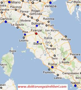 Pisa ( 75 km ) , Siena ( 60 km ) , Roma ( 230 km ) , Venedik ( 204 km ) , Bologna ( 80 km ) , Genova ( 482 km ) , Milan ( 249 km ) , Napoli ( 408 km )