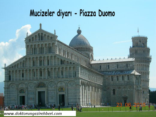 Bu üçlü ; Duomo, Batistero ( Vaftizhane ) ve yuvarlak Campanilesi ' dir ( eğik kule ) . Çimenler içinde yer alan bu yapıtta ; gri beyaz yatık mermerlerden yapılmış olan Duomo en çok ilgi çeken ,kopya edilen bölümdür.Katedralde baş yapıt oymalı vaiz kürsüsüdür.Karşısında Galileonun lambası bulunur .Her üç parçada başlanıldığından yıllar sonra tamamlanmıştır.Piza kulesinin yapımı tam 174 yıl almıştır.Yapıtın en ilgi çekeni ise ; Dikey konuma göre 4.5 m.eğilmiş olan 57 m.lik campanile ( kule ) dir.