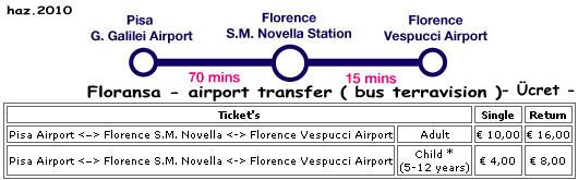 Pisa airport – Florance shutle transfer ~ 70 € dolayındadır..Terravision Otobüs bilgi hattı : Terravision Otobüs bilgisi için tıklayın , Ücret : Pisa airport – Floransa (SMN ) merkez ; Erişkin – 10 € ( tek yön ) , gidiş dönüş 16 € ‘ dur.