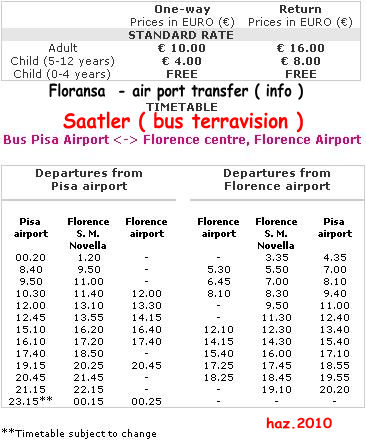 Bu otobüs şirketi diğer hava alanından da ( Pisa airport ) yolcu taşımaktadır.Pisa’dan Floransa ( SMN ) ulaşımı 70 dk.sürmektedir.Her iki alan transferi ayni ücrettir!. Erişkin: 10 € tek yön ( gidiş dönüş – 16 € ) bilet fiatıdır.