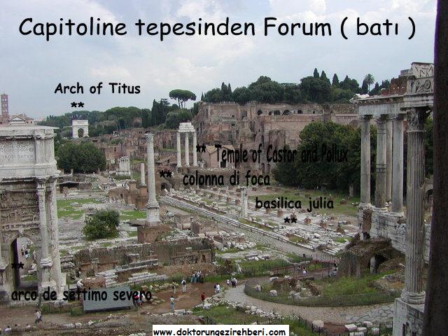 Forum Roma’nın bir ucu ( doğu ) Kolesyum bölgesi & Palatino tepeleriyle başlar , diğer ucu ( batı ) Piazza del Campidoglio bölgesi & Capitoline tepesiyle “ Palazzo Senotorio “ da biter.