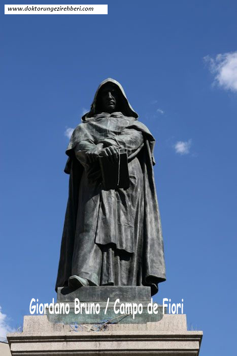 Bruno; evrenin merkezinde Güneş’in yer aldığını iddia edince, 1600’de, engizisyonun kararıyla Campo de’ Fiori’de diri diri yakılmıştır. Heykeltıraş Ettore Ferrari, 1887’de Bruno’nun heykelini idam ettirildiği yere diktirerek Giordano Bruno isminin uzun yıllar yaşamasını sağlamıştır.