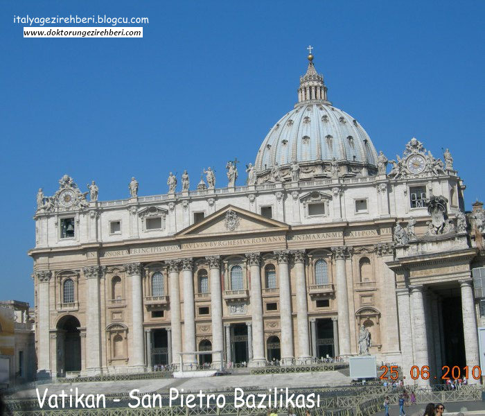 Yapımına 1506 da başlanan bazilika ( Basilica di San Pietro in Vaticano ) dünyanın en büyük Katolik kilisesidir. Dıştan uzunluğu 212 m. ( iç 187 m.) , yüksekliği ( kubbe tepesine kadar - kubbe Michelangelo eseridir - ) 132 m. dir. 60 bin kişi kapasitelidir. Bazilikanın mimarları arasında Donato Bramante, Antonio da Sangallo, Michelangelo, Vignola, Giacomo della Porta, Carlo Maderno, Gianlorenzo ve Bernini’nin isimleri sayılmaktadır.