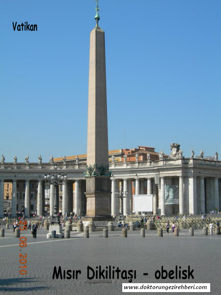Bernini ‘ nin görkemli yapıtı olan bu alanda bulunan revaklar ( ön yüz kemerli – arkası duvar önü açık sundurma anlamında kullanılır ) arasında kalan meydan , 300 bin kişiyi içine alabilir.Meydan ilk Hıristiyanların şehit edildikleri Nöron sirki yanında bulunur. Bernini 11 yılda , 284 traverten sütun ile üzerinde 140 aziz heykelini tamamlamıştır. Meydanın ortasında,Mısır’ dan getirilen 25 m. yükseklikte kırmızı granitten obelisk ( dikilitaş ) bulunur.