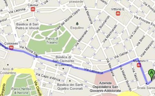 B - Roma şehir mrk. , A - otel , M - metro istasyonları / yürüme yol güzergahı