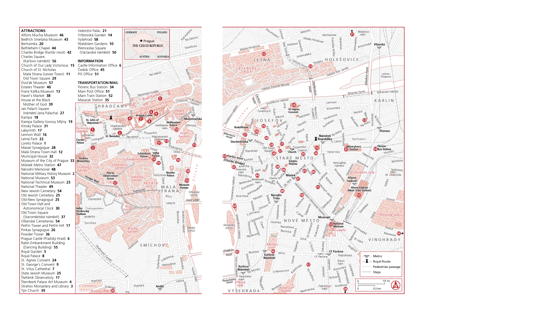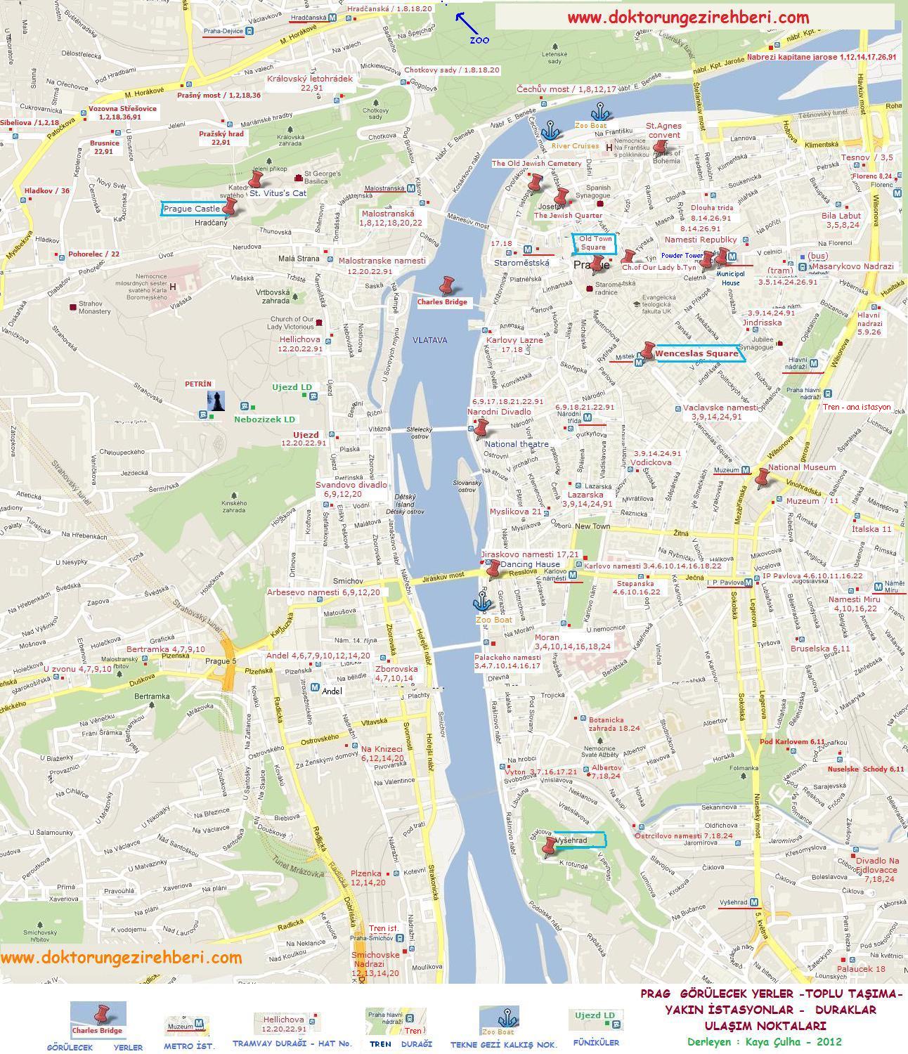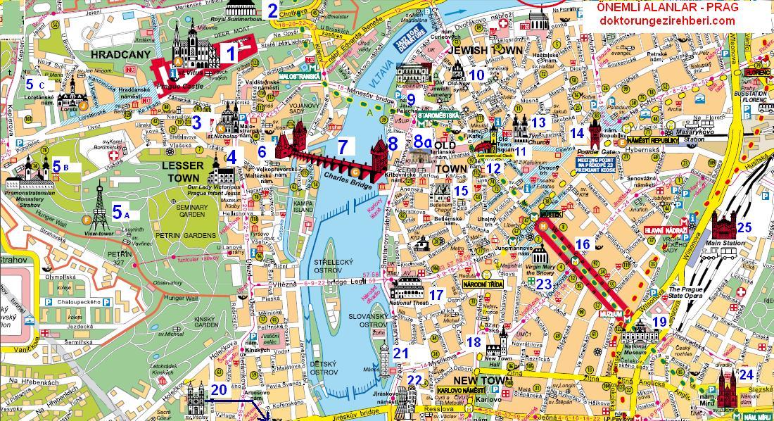 1 - Prag Kalesi , 2 - Belvedere , 3 - St. Nicholas Kilisesi , 4 - Prague baby Jesus ( Prazska jezulatko ) , 5 A - Petrin gözetleme kulesi < ayna labirent, füniküler >, 5 B - Strahov Manastırı , 5 C - Loreta meydan & manastırı , 6 - Lesser town bridge tower , 7 - Charles Köprüsü , 8 - Old town bridge tower , 8a - Klementinum , 9 - Rudolfinum konser salonu , 10 - Josefov - Prag Yahudi mahallesi , 11 - Old Town Square , 12 - Orloj ( astronomical clock ) ve Old Town Hall < suquare >, 13 - Tyn Kilisesi , 14 - Powder Tower ve Municipal House , 15 - Betlem Şapeli , 16 - Wenceslas Meydanı , 17 - National Theatre ( Devlet Tiyatrosu ) , 18 - New Town Hall , 19 - National Museum ( Ulusal Müze ) , 20 - St. Wenceslas ( sv Vaclav ) - Smichov manastırı , 21 - The Manes Exhibition Hall ( Manes sergi salonu ) , 22 - Dancing House , 23 - Church Of Virgin Mary The Snowy ( Meryem ana kilisesi ) , 24 - Chram Sv .Ludmila ( Aziz Ludmila Kilisesi ) , 25 - Hlavni Nadrazi ( Main Train Station )